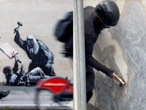 L'opera di Bansky che rappresentava un giudice che picchiava un manifestante - riferimento agli arresti a una manifestazione per la Palestina - è stata cancellata e sui social girano molti video della Polizia che protegge chi la sta coprendo.