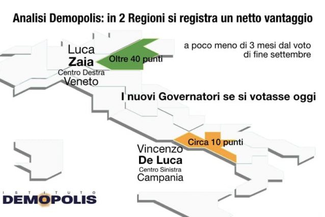 Cresce il consenso per il presidente della Regione Campania Vincenzo De Luca. Il governatore “col lanciafiamme” guadagna un +4,9% nel gradimento degli elettori campani nel sondaggio Governance Poll 2020 dell'Agenzia Noto per il Sole24Ore, realizzato sulla base di interviste fatte lo scorso giugno, e si piazza all'11esimo posto, con un gradimento del 46%, tra Enrico Rossi, governatore della Toscana (10°), e Sebastiano Musumeci, presidente della Regione Sicilia (12°).
