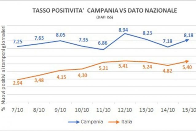 In Campania il tasso di positività della Covid19, cioè la percentuale di nuovi positivi al tamponi giornalieri, secondo i dati dell'Istituto Superiore di Sanità (ISS), è salito oggi all'8,18%: ecco perché il governatore Vincenzo De Luca ha chiuso le scuole e bloccato i matrimoni con l'ordinanza numero 79 firmata oggi 15 ottobre 2020. Secondo l'Unità di Crisi sono in aumento anche i casi sintomatici.