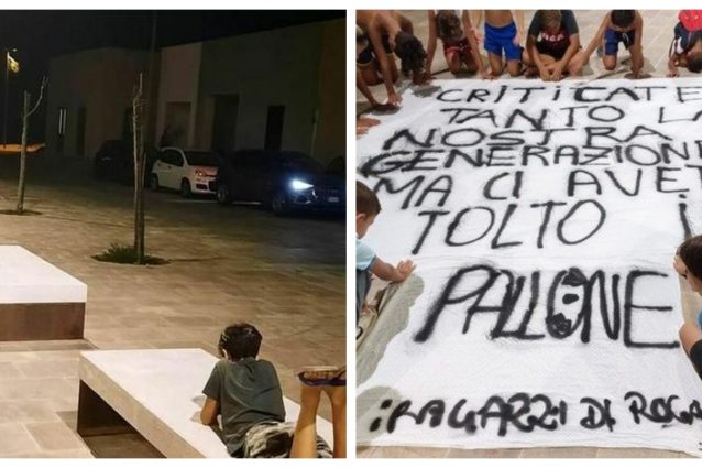 Il Comune di Meledugno, in provincia di Lecce, ha vietato ai bambini di giocare a pallone in piazza. Loro hanno organizzato una protesta con tanto di striscioni.
