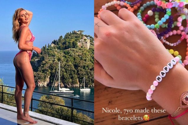 Tra i braccialetti colorati realizzati con perline di plastica, non è sfuggito il prezioso gioiello al polso di Valentina Ferragni, in oro e zaffiri. L'occhio è un simbolo dal significato profondo.