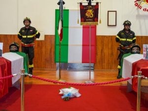 I funerali dei due vigili del fuoco Nicola Lasalata e Giuseppe Martino sono stati celebrati oggi pomeriggio a Matera con un funzione religiosa solenne. "Hanno dato la vita per aiutare ognuno di noi a vivere una vita migliore" ha ricordato l'arcivescovo nell'omelia.