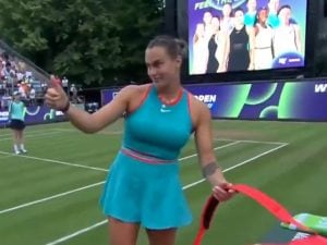 Dopo aver vinto il 1° set, la bielorussa esplode contro il supervisore che accetta le obiezioni di Masarova: campo scivoloso, stop alla gara. "Ma come? Ho appena giocato due game su quel lato...".