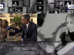 Episodio grottesco durante la diretta del Tg1 dai funerali di Pippo Baudo: la signora ha "rubato" i fiori da una corona funebre per il presentatore televisivo.