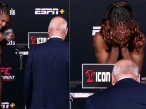 La campionessa UFC Angela Hill è stata, suo malgrado, protagonista di un momento oltre l'imbarazzo alla prova del peso in vista del match contro Iasmin Lucindo: un funzionario UFC le ha fatto volare via l'imbottitura di silicone del reggiseno, finita a terra davanti a fotografi e telecamere.
