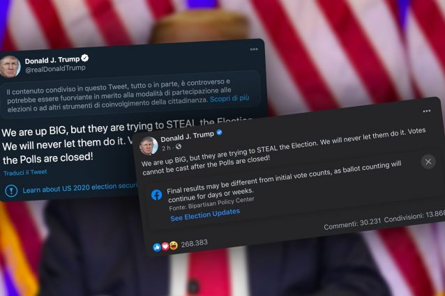 L'attuale presidente degli Stati Uniti sta accusando preventivamente gli avversari politici di possibili brogli, ma gli interventi pubblicati al riguardo sui due social più seguiti ne violano le regole. L'esito delle consultazioni infatti non è ancora definitivo e accuse simili possono provocare disordini.