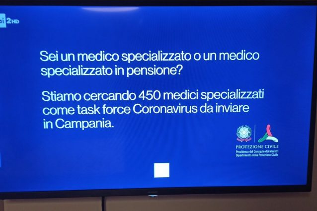 Il Dipartimento nazionale di Protezione Civile si è impegnato per dotare la Campania di altri 450 medici per combattere l'emergenza Coronavirus: il bando, avviato lo scorso 15 novembre, scade domani, mercoledì 18 novembre. Ecco perché, da qualche giorno, in televisione, sulle reti Rai, è possibile vedere l'annuncio durante gli stacchi pubblicitari.
