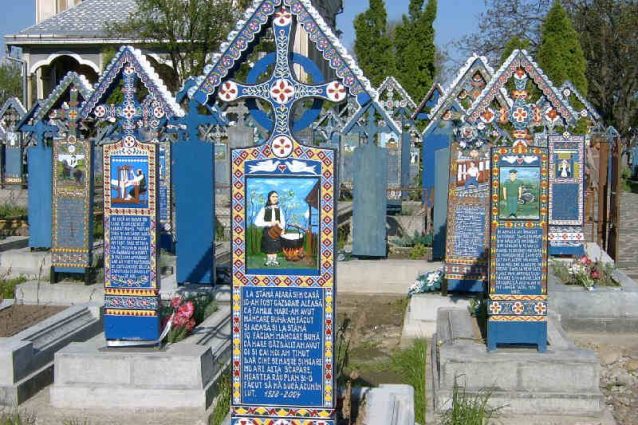 Niente pietra fredda e austera presso il Cimitirul Vesel, dietro la Chiesa dell'Assunta nel villaggio di Săpânța, questo piccolo cimitero in Romania aggiunge un po' di colore e vivacità alla morte. Qui ogni tomba è dipinta del blu radioso del cielo ed è arricchita con un dipinto e una poesia originale che rivelano qualcosa sulla vita e il carattere del defunto.
