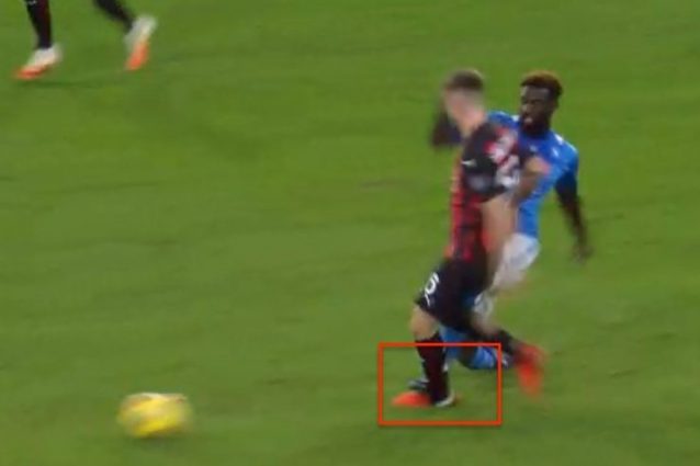 Un brutto fallo di Bakayoko è il primo episodio da moviola di Napoli-Milan. I rossoneri protestano per la mancata espulsione del centrocampista del Napoli a causa del suo intervento sulla caviglia di Saelemaekers. Dal fermo immagine si nota come l'ex mediano del Chelsea colpisca all'articolazione l'avversario con la suola della scarpetta.