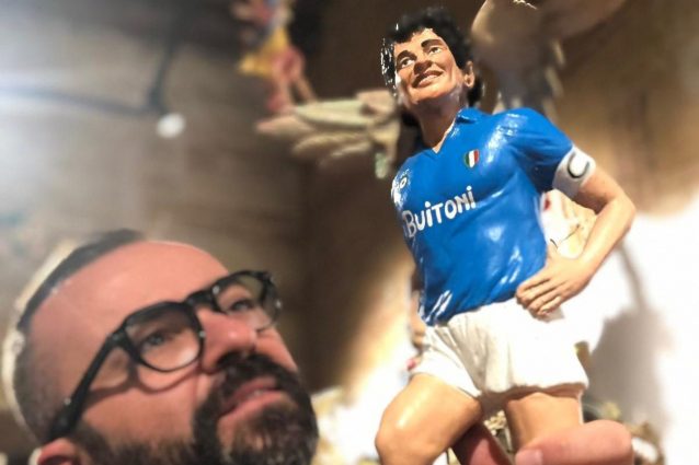 L'angelo con le ali di Diego Armando Maradona atterra a San Gregorio Armeno. Opera del maestro presepiaio Genny Di Virgilio, la statuetta è un omaggio dell'artista per il più grande calciatore di tutti i tempi. Il Pibe de Oro è rappresentato con i calzoncini bianchi e la maglia azzurra del Napoli e lo scudetto.