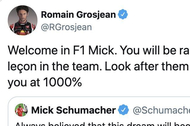 Dopo l'incidente di domenica Romain Grosjean è stato appena dimesso dall'ospedale di Manama pur dovendo continuare le cure per le ferite riportate. Nonostante ciò il pilota francese ha trovato il tempo e il modo per dare il benvenuto in Formula 1 a Mick Schumacher (che dal prossimo anno prenderà il suo posto) e omaggiare gli uomini della Haas nonostante sia già stato "liquidato" da tempo dalla scuderia statunitense.