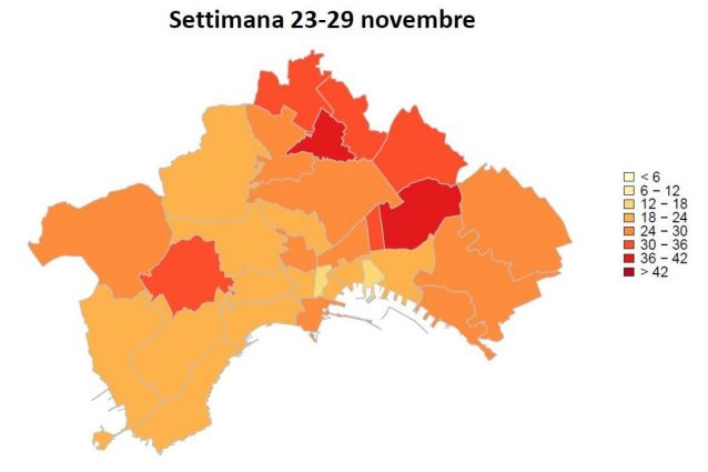 Sono Miano e Poggioreale i quartieri più colpiti dal Coronavirus nella settimana dal 23 al 29 novembre con 36-42 casi su 10mila abitanti. Seguono Scampia, Secondigliano, Stella, Soccavo e Vicaria con 30-36 casi su 10mila. Anche se nel complesso i numeri dei nuovi positivi sono in calo rispetto alla settimana precedente e si registra un miglioramento in tutta la città, dove i casi di contagi risultano quasi dimezzati rispetto alla settimana precedente.