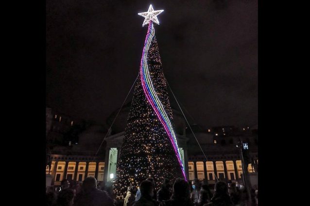 Acceso l'albero di Natale 2020 in piazza del Plebiscito a Napoli, alla presenza del sindaco De Magistris. L'Albero è alto 14 metri, decorato con oltre 7mila luci a led, una stella gigante e avvolto una cascata arcobaleno che richiama il messaggio di speranza contro il Covid19 “Andrà tutto bene”. L'opera è offerta da Confesercenti Campania e dall'associazione Luminaria Italiana, con la collaborazione del Comune di Napoli. Resterà acceso fino alla Befana.