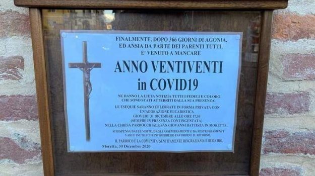 A Moretta il parroco ha deciso di annunciare la funzione dell'ultimo dell'anno con un manifesto funebre per celebrare la fine del 2020. "Danno il lieto annuncio tutti i fedeli" scrive sul manifesto che ha fatto sorridere i social. Il parroco ci tiene però a specificare che l'ingresso resterà contingentato per evitare assembramenti.