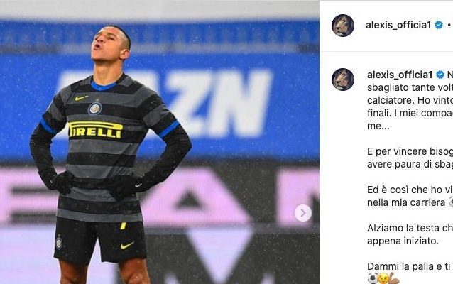 Dopo aver fallito un calcio di rigore contro la Sampdoria, Alexis Sanchez si è mostrato molto sicuro sui social, dove ha scritto un post in cui mostra tutta la sua fiducia per la stagione dell'Inter: "Nella mia vita ho sbagliato tante volte, ma i compagni si sono fidati di me. Dammi la palla e ti faccio vincere".
