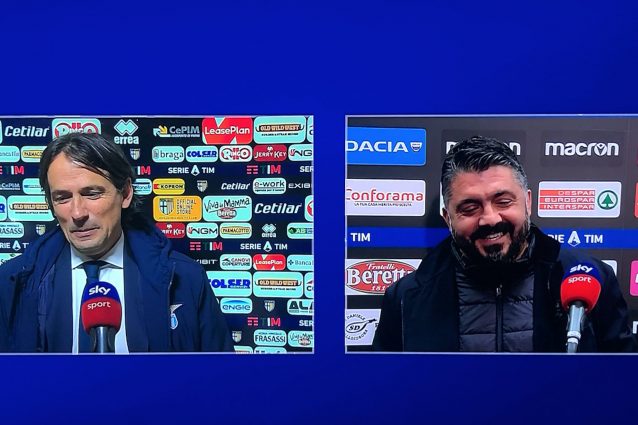 Nel post-partita di Parma-Lazio e Udinese-Napoli, Simone Inzaghi e Gennaro Gattuso si sono ritrovati in collegamento ai microfoni di Sky. I due, soddisfatti per le vittorie delle proprie squadre, hanno dovuto fare i conti con un calo di voce, su cui Ringhio ci ha scherzato su, tirando un ballo un altro collega.