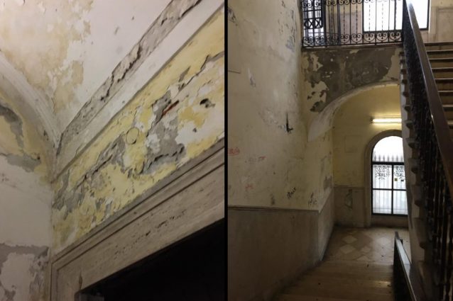 Il torrino dell'ascensore del Ponte di Chiaia devastato dalle infiltrazioni, pieno di crepe e graffiti, sporco e abbandonato al degrado. La struttura del ponte era stata restaurata nel 2017, nell'ambito del progetto Monumentando con un costo di 265mila euro, dopo il crollo di alcuni calcinacci dalla volta dell'arco a causa delle infiltrazioni e del maltempo. Denuncia al Comune dei consiglieri Roberta Giova e Diego Venanzoni, che hanno presentato un dossier fotografico sullo stato di degrado e abbandono.