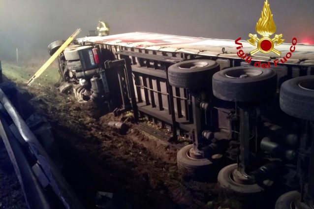 Incidente stradale all'alba vicino Milano, sull'Autostrada A1. Un tir ha sfondato il guardrail ribaltandosi su un fianco nei pressi dello svincolo per Melegnano. Il conducente del mezzo pesante è rimasto incastrato nella cabina ed è stato liberato dai vigili del fuoco: non ha riportato gravi ferite.