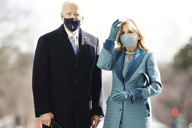 Per la sua prima apparizione da First Lady Jill Biden ha indossato un cappotto di tweed turchese con i reverse di velluto, abbinato a un vestito e a una mascherina dello stesso colore. Una scelta che ha un duplice valore simbolico, sia nella scelta del colore che dello stilista che l'ha vestita per questa giornata storica.