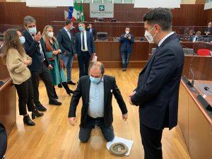 Seduta sospesa e intervento della Digos questa mattina al Consiglio regionale della Lombardia. Clima infuocato per il caso dell'errore nei dati che ha spedito la Lombardia in zona rossa per una settimana. Dopo l'intervento di Fontana, il consigliere di + Europa Michele Usuelli si è inginocchiato in aula per chiedere di rendere pubblici i dati disaggregati sull'epidemia. Il collega del Pd Bussolati ha invece consegnato un pallottoliere a Fontana.