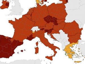 La mappa covid Ue aggiornata oggi dal Centro europeo per la prevenzione e il controllo delle malattie. Per l'Italia sono soltanto due le aree indicate con il rosso scuro vale a dire il colore che segnala zone ad alto contagio: la provincia di Bolzano e la regione Friuli Venezia Giulia. Quasi tutte le restanti regioni sono invece rosso a parte la Valle D'Aosta che è è arancione.