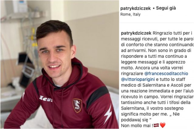 Patryk Dziczek si è mostrato sorridente e sereno in una foto pubblicata su Instagram. Il centrocampista polacco della Salernitana, che sabato scorso durante la sfida contro l'Ascoli era stato colto da un attacco epilettico in campo, ha voluto ringraziare tutti coloro i quali gli sono stati vicini in quei momenti difficili.
