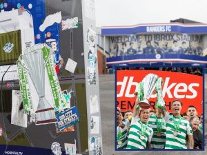 La Premiership scozzese è ancora ferma e forse non ripartirà più. E' per questo motivo che si sta decidendo il destino del titolo 2019/2020 che potrebbe venire assegnato al Celtic Glasgow, primo in classifica al momento del lockdown. La tifoseria biancoverde ha tappezzato lo stadio dei Rangers con adesivi inneggianti al titolo, definito dai rivali "uno scudetto di cartone"