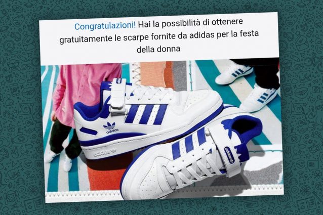 Le vittime designate ricevono sulla piattaforma di messaggistica una missiva nella quale viene loro comunicato di avere la possibilità di ricevere gratis delle calzature con il marchio della nota multinazionale tedesca. Il link allegato porta però a un sito pensato per fare incetta di dati personali.