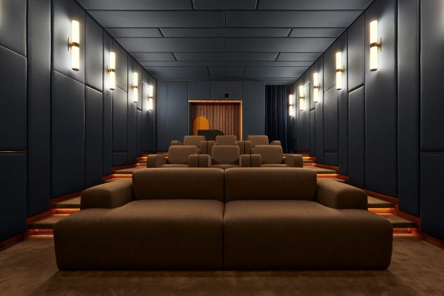 Lo studio di architettura Ahochdrei ha trasformato la vecchia cantina di una villa progettata da Mies van der Rohe, appena fuori Berlino, in Germania, in un home cinema di lusso. L'elegante sala proiezioni può ospitare fino a dodici posti a sedere su quattro file discendenti e il cinema stesso è concepito come un'esperienza spaziale unica.