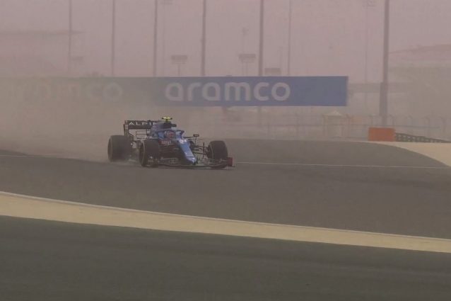 La prima delle sole tre giornate dei test invernali che precedono il Mondiale di Formula 1 2021 in Bahrain è stata contraddistinta da una tempesta di sabbia. Alcune scuderie hanno deciso di rinunciare in modo quasi totale alla mattinata dei test. Il primo a scendere in pista, nonostante la tempesta di sabbia, è stato il francese Esteban Ocon, pilota della Alpine.