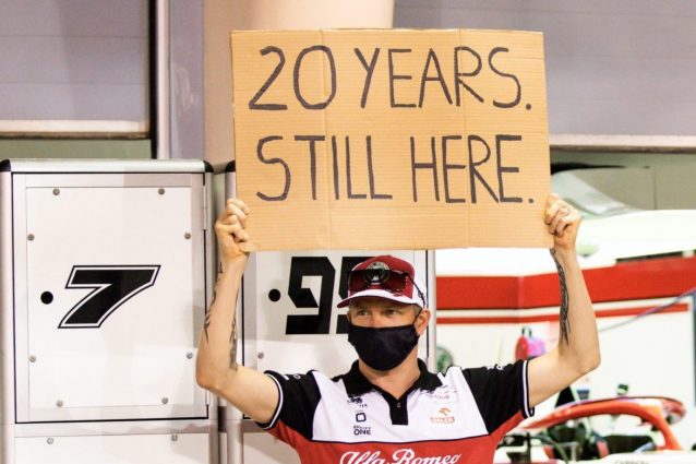 In Bahrain Kimi Raikkonen ha festeggiato i suoi vent'anni in Formula 1. Nel 2001 ha esordito con la Sauber, nella prima gara del 2021 si è classificato undicesimo nel Gran Premio del Bahrain, e prima della gara ha celebrato l'evento facendosi immortalare con un cartello sul quale era scritto: "Sono 20 anni è sono ancora qui".