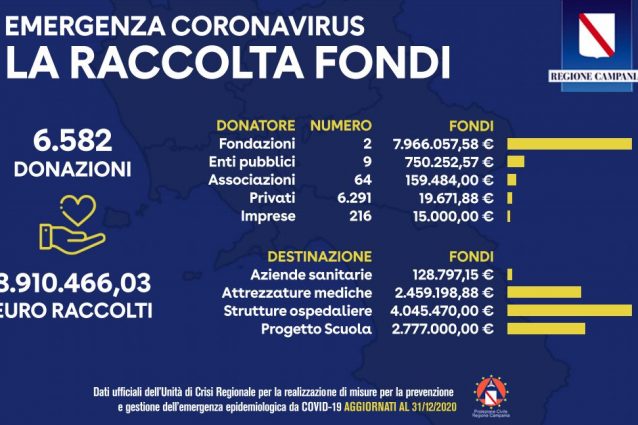 Raccolta fondi per far fronte all'emergenza Coronavirus in Campania: ad un anno dall'inizio della pandemia (marzo 2020) sono quasi 9 milioni di euro i fondi pervenuti alla Regione, ad un conto corrente ad hoc. Soldi a ospedali, per i termoscanner scolastici ma anche per mascherine e guanti in ambito medico.