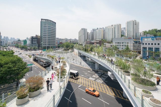 Lo studio di architettura MVRDV ha trasformato un'ex autostrada interna di Seul in un parco pubblico lungo 983 metri. Seoullo 7017 Skygarden è il nuovo simbolo verde della città coreana che ospita un'enorme varietà di specie di piante coreane, oltre 50 famiglie di piante, tra cui alberi, arbusti e fiori esposti in 645 vasi di alberi, per un totale di circa 228 specie e sottospecie..