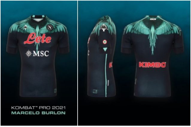 Kombat Pro 2021 made in Kappa e firmata da Marcelo Burlon è la nuova maglia che il Napoli indosserà in occasione della sfida di campionato contro l'Inter. Sul petto mostra un uccello stilizzato con le ali spiegate che campeggia sulla versione in colore nero e giallo (per i portieri): è il simbolo dello stilista originario della Patagonia e tifoso di Maradona.