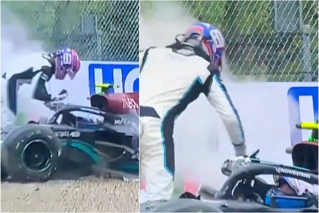 Bruttissimo incidente a Imola per un contatto tra Bottas e Russell alla curva del Tamburello che ha visto le due auto finire fuori pista con tantissimi detriti che hanno costretto i commissari di gara a sventolare immediatamente la bandiera rossa. Russell, quando uscito dalla vettura, ha rifilato uno schiaffo a Bottas sul casco per via del dito medio mostratogli dal pilota della Mercedes.
