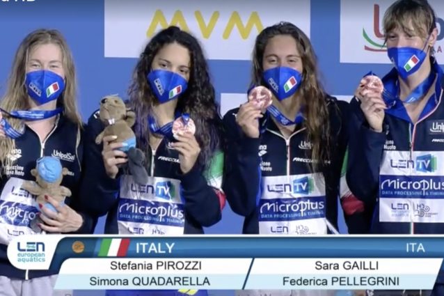 La 4x200 femminile ha conquistato la medaglia di bronzo agli Europei di Nuoto di Budapest. Federica Pellegrini con un finale straordinario è riuscita ad artigliare la medaglia. Bravissime tutte e quattro le azzurre, le altre: Pirozzi, Gailli e Simona Quadarella, che oggi ha vinto anche l'oro nei 1500 stile.