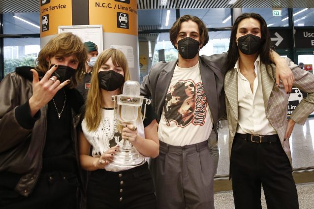 I Maneskin sono appena rientrati in Italia dopo aver vinto l'Eurovision Song Contest 2021 e, oltre a essere stati accolti in modo trionfale, hanno sfoggiato dei look "autoreferenziali". Damiano e Vittoria hanno infatti completato gli outfit con delle t-shirt con su stampate le foto della band al completo.