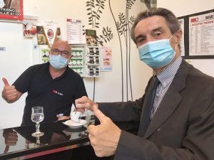 Il presidente della Lombardia Attilio Fontana ha pubblicato su Facebook una foto mentre beve un caffè al bancone di un bar: "Da oggi ristoranti e bar possono ospitare i clienti anche all'interno, sia a pranzo che a cena", ha scritto, aggiungendo: "I dati della Lombardia confermano la discesa dei contagi. La fascia bianca si avvicina e finalmente potremo anticipare anche l'abolizione del coprifuoco".