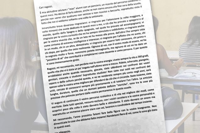 Antonio, giovane (e precario) docente di Spagnolo all'Istituto Comprensivo 'Sabatino Minucci' di via Domenico Fontana a Napoli, ha commosso studenti e genitori con una lettera d'addio destinata agli allievi che ha istruito per un anno: "Ragazzi, mi raccomando, non perdete mai la vostra energia: vivete sempre la vita a 360 gradi, quella vita che vi è stata un po' negata nell'ultimo anno e mezzo".