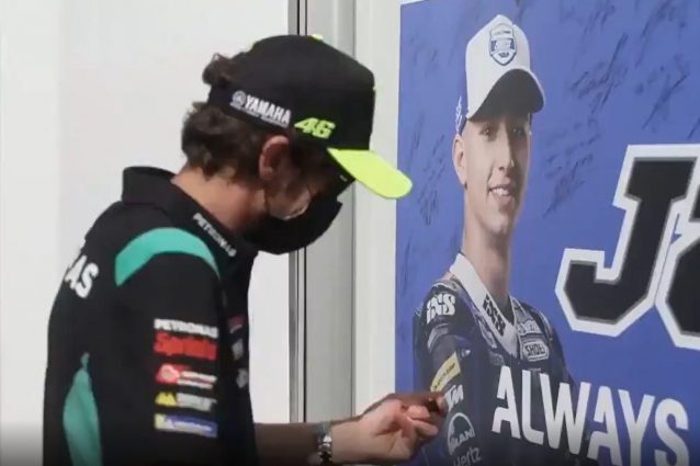 Tutti i piloti della MotoGP raccolti a Barcellona per il GP della Catalogna hanno voluto lasciare un ultimo messaggio per il giovanissimo collega Jason Dupasquier morto dopo l'incidente in pista al Mugello. Da Valentino Rossi a Marc Marquez, da Fabio Quartararo a Pecco Bagnaia, tutti hanno firmato e scritto una dedica sull'enorme cartello installato nel paddock del circuito spagnolo in onore del 19enne svizzero che ha perso la vita pochi giorni fa.
