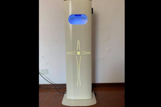 Arriva nelle chiese l'acquasantiera elettronica che sanifica l'acqua benedetta contro il Coronavirus e la eroga ai fedeli. Inventata dall'imprenditore napoletano Antonio Beneduce che l'ha brevettata. Sanifica l'acqua e la eroga tramite sensori, senza contatto con il dispositivo, nel rispetto delle norme anti-Covid19.