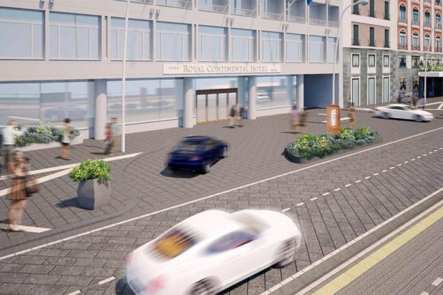 Gli ingressi degli hotel del Lungomare di Napoli come quelli di Dubai, con ampie aree esterne per accogliere i clienti che arrivano in taxi, limousine o in navetta e isole con le aiuole spartitraffico in pietra lavica, al posto delle attuali fioriere, come avviene nei grandi alberghi dei paradisi tropicali e delle capitali del turismo internazionale. Il progetto di restyling di via Partenope del Comune, con i render dello studio Discetti.