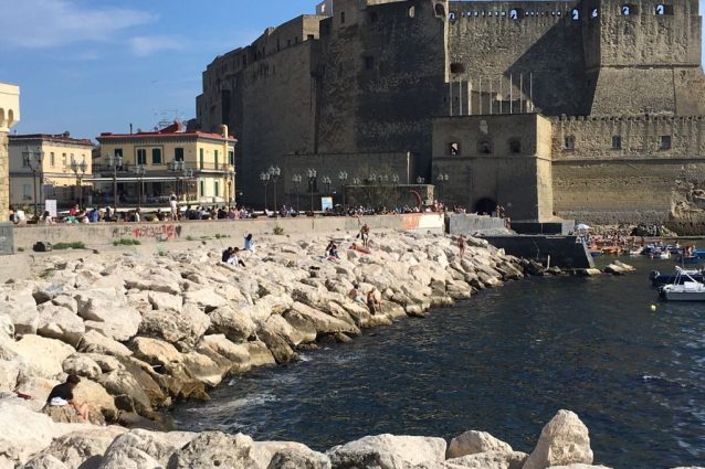 Chiazze bianche nel mare di Castel dell'Ovo, preso d'assalto ieri dai bagnanti stesi sulle scogliere frangiflutto a prendere il sole o impegnati a tuffarsi dalla piccola insenatura a ridosso del ponte e della fortezza. Macchie biancastre anche sul Lungomare Caracciolo, tra la Colonna Spezzata e la Rotonda Diaz.