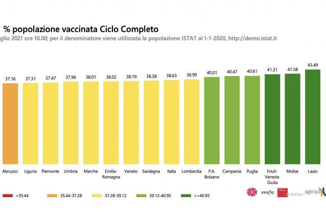 Come evidenzia il report Agenas sulla campagna vaccinale (dati aggiornati al 12 luglio), infatti, il Lazio è in testa, nettamente, per quanto riguarda la percentuale di popolazione vaccinata: 43,49 per cento, contro il 41 per cento di Friuli e Molise. La Calabria, ultima in classifica, è al 34 per cento. In una settimana la regione amministrata da Zingaretti è passata dal 39,49 al 43,49 per cento, facendo segnare un più 4 per cento.