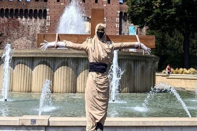In piazza Castello a Milano è comparso un manichino rappresentante una donna che veste un burqa crocifisso in segno di protesta e in sostegno verso le donne afgane rimaste in balìa della furia talebana dopo la fuga dell'esercito americano e la conseguente presa di Kabul. L'opera provocatoria porta la firma di Cristina Donati Mayer.