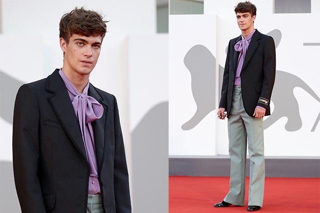 Per il suo primo red carpet veneziano l'attore Lorenzo Zurzolo, 21 anni, ha scelto un completo anni Settanta con un dettaglio molto particolare: una camicia con fiocco lilla. L'eleganza non ha genere: gli idoli degli adolescenti rifiutano le etichette e amano giocare con la moda maschile e femminile.