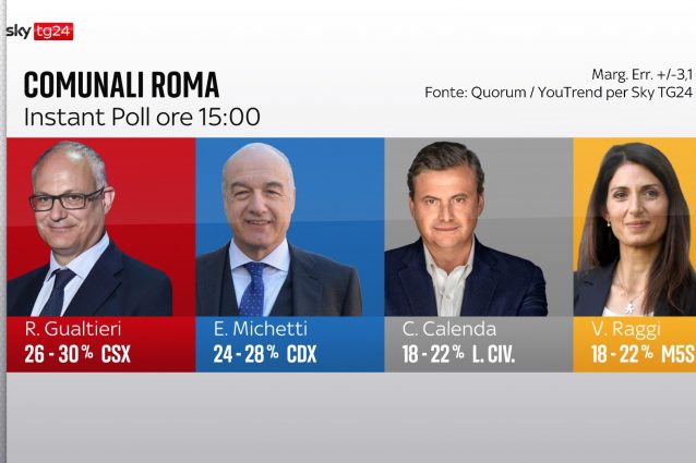 Sky Tg 24 ha diffuso i primi instant poll sulle elezioni comunali a Roma a cura di Quorum YouTrend. Secondo l'istituto di Lorenzo Pregliasco, Enrico Michetti è accreditato del 24-30 per centro, Roberto Gualtieri del 26-30 per cento, Carlo Calenda del 18-22 per cento e Virginia Raggi del 18-22 per cento.