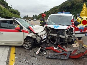 Impatto violentissimo fra una vettura e una ambulanza veterinaria sulla sulla strada statale 7 bis a Monteforte Irpino in località Campi (Avellino). Vigili del fuoco estraggono dalle lamiere un uomo ed una donna, portati dal 118 al Moscati di Avellino.