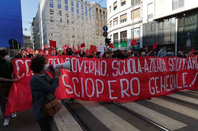 Corteo in centro a Milano per lo sciopero generale nazionale proclamato dai sindacati di base. Assieme ai lavoratori protestano anche gli studenti: nel mirino le classi pollaio e la riforma della scuola proposta dal governo Draghi utilizzando i fondi del Pnrr. Il corteo è partito alle 10 e terminerà in corso Monforte.