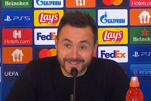 Roberto De Zerbi risponde polemicamente alla domanda di un giornalista spagnolo dopo la disfatta interna del suo Shakhtar contro il Real Madrid. Secondo il tecnico ex Sassuolo il primo dei cinque gol messi a segno dalla squadra di Carlo Ancelotti sarebbe viziato da un fuorigioco attivo di Benzema.